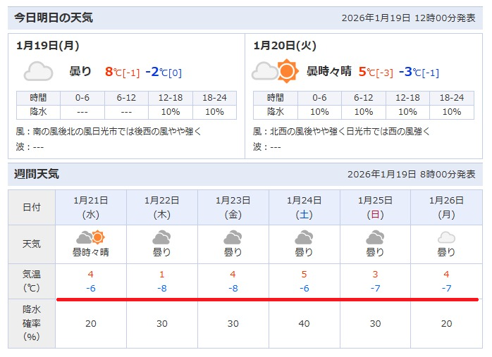 一般に、気温が-4℃を下回ると、給湯配管や水道などの凍結が非常に発生しやすくなります。 2026/1/19(月)の予報によると大田原市では 2026/1/21(水) 以降、最低気温が「-5℃」を下回る日が続き、最高気温も「5℃」など、非常に低温な予想となっています。